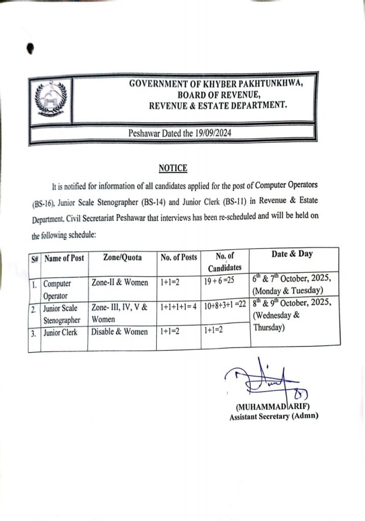 Interviews for the post of Computer Operators (BS-16), Junior Scale Stenographer (BS-14) and Junior Clerk (BS-11) in Revenue & Estate Depatrment, Civil Secretariat Peshawar has been re-scheduled